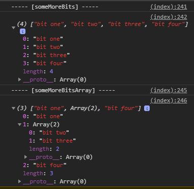 someMoreBits = [ "bit one", ...someBits, "bit four"]; // this shows how the operator can be used to insert the elements of the someBits array into this array, without the operator it will add the full array
